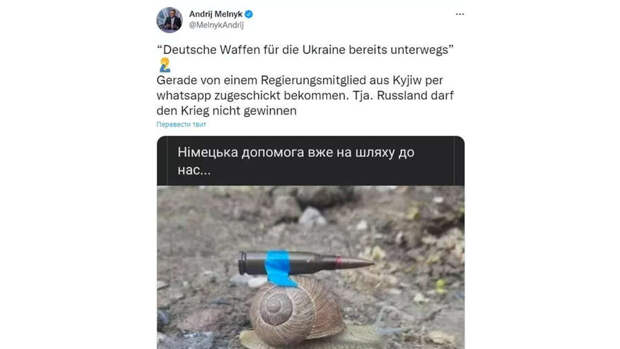 На размещенной фотографии демонстрируется улитка с прикрепленной к ее панцирю патроном.Других комментариев, касательно комментариев по поставка оружия Киеву Берлином, Мельник не привел.
