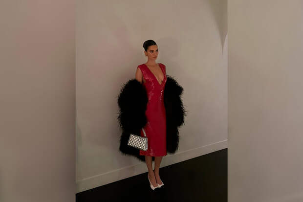 Кендалл Дженнер показала образ, который выбрала для католического Рождества. Модель предстала перед камерой в красном платье-миди с глубоким декольте, украшенном пайетками.