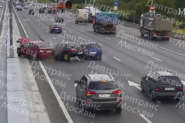 На кадрах видно, что красный седан Kia потерял управление после касательного столкновения с самосвалом в правом ряду. Вращаясь вокруг своей оси, Kia пересек проезжую часть МКАД справа налево и врезался в разделительный отбойник, задев при этом универсал Lada. После этого в Kia врезался черный седан Subaru, двигавшийся в левом ряду, а в Lada - еще один автомобиль.