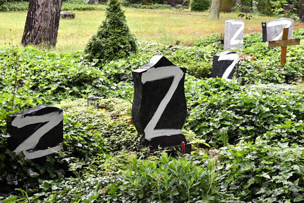 Накануне утром сотрудники по уходу за могилами и зелеными насаждениями обнаружили граффити на 83 могилах на кладбище Вальдфридхоф в районе Берлин-Целендорф. Вандалы использовали белую краску, чтобы нарисовать на надгробиях большую букву Z, кроме того, этот знак был замечен и на нескольких мусорных баках.