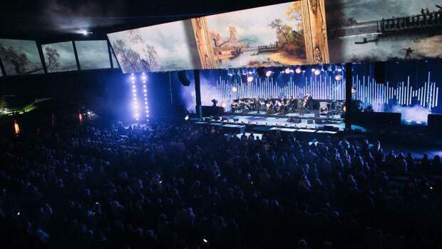 На концертной сцене представлены видеоинсталляции "Ожившие картины", поддерживающие концепцию экспозиции - соединение живописи, цвета и музыки.