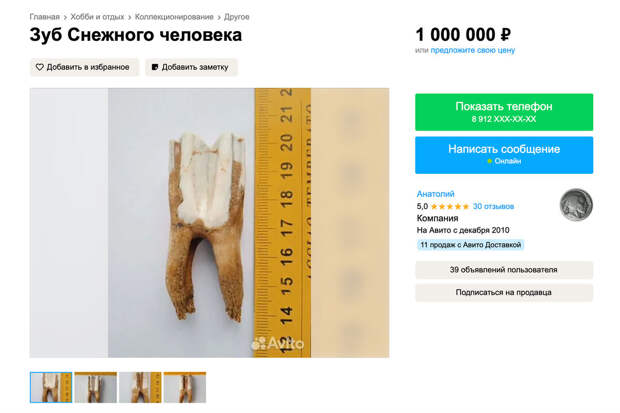 "Переправился на лодке через реку, вышел на берег и увидел на земле зуб - чистенький, беленький. По форме он оказался очень похожим на человеческий, но по размеру был уж очень большим. В голове сразу возникла ассоциация со снежным человеком. Так собственно он и оказался на сайте объявлений. А цену я взял с потолка", - поделился собеседник.