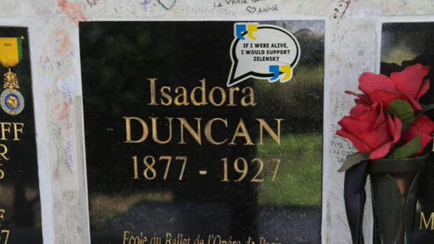 Наклейки с надписью "Если бы я был жив, то поддержал бы Зеленского" появились на надгробиях писателей Оскара Уайльда и Оноре де Бальзака, певицы Эдит Пиаф, рок-музыканта Джима Моррисона, танцовщицы Айседоры Дункан и др.