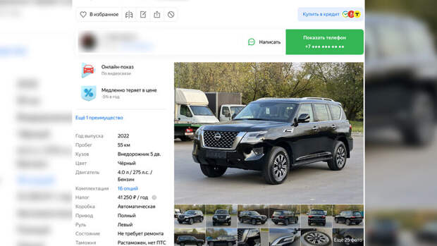 В зависимости от комплектации Nissan Patrol оснащены адаптивными фарами, мультимедиа-системой с 12-дюймовым дисплеем, креслами с функцией памяти, камерами (спереди и сзади) и прочими опциями. В некоторых объявлениях указано, что автомобиль ввезен из ОАЭ.