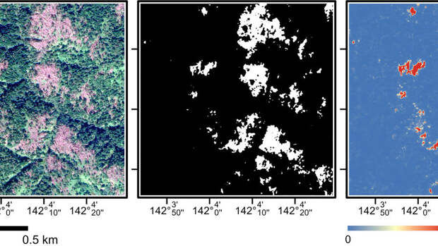 У разных типов нарушений лесов есть хорошо узнаваемые паттерны на спутниковых снимках. У авторов уже были опыт визуальной экспертной оценки состояния лесного покрова и данные полевых исследований, выполненных на островах Кунашир и Сахалин. На их основе они создали маски целевых областей — ветровалов и усохших деревьев, атакованных короедом-типографом. Маски и соответствующие им спутниковые изображения стали исходными данными для обучения нейронных сетей. Далее обученные нейронные сети были успешно применены к спутниковым снимкам для обнаружения аналогичных типов нарушений в островных лесах.