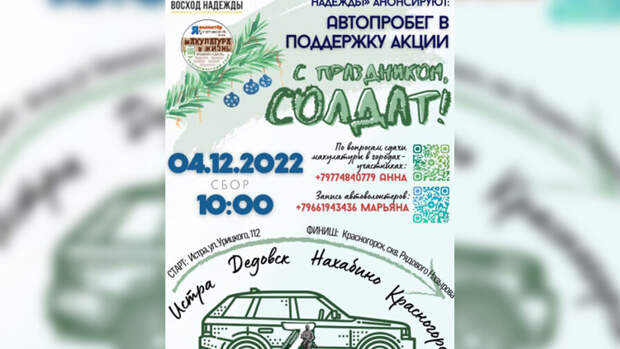 "С праздником, солдат" - это другая акция, с автопробегом она не совсем связана, просто организаторы одни. Это новогодняя акция. Здесь предполагается, что они подготовят для бойцов сладкие подарки, будут направлять посылки. А по автопробегу – это другая история. Сейчас мы корректируем эту информацию, взаимодействуем с инициатором этих акций и будем предоставлять уже другую картинку, более понятную для жителей и для СМИ. Картинка будет заменена, она будет другой. Они все в один постер вложили. Соглашусь, это неправильно", - объяснили в пресс-службе.