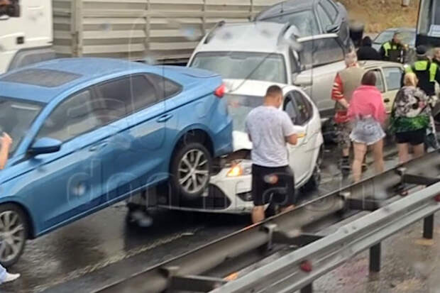 Очевидцы запечатлели последствия массового столкновения. На кадрах видно, что на проезжей части лежит автомобиль, который после столкновения перевернулся и приземлился на крышу.