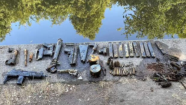 После этого ребята начали искать предметы в воде и вытащили несколько пистолетов, автоматов и боеприпасов.