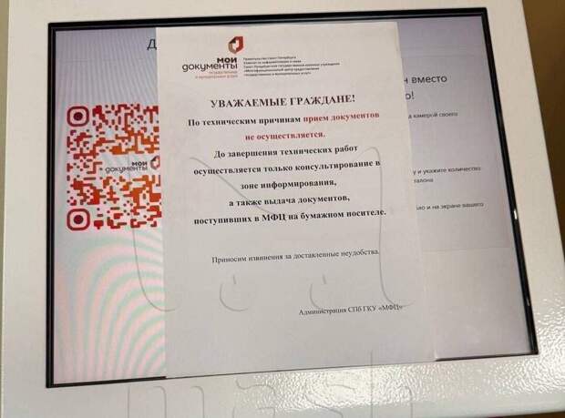 В Санкт-Петербурге произошел масштабный сбой в работе МФЦ — учреждения временно не принимают документы. Об этом сообщил Telegram-канал "Mash на Мойке".