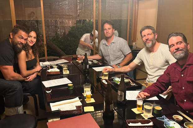 На одном из кадров 44-летний Джейсон Момоа обнимал 32-летнюю Адрию Архону. Знаменитости были запечатлены в кафе. Они сидели за столом с друзьями и улыбались фотографу.