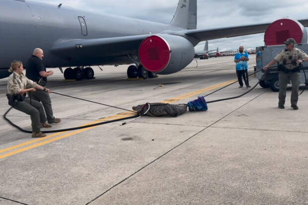 Инцидент произошел на военной базе ВВС в округе Хиллсборо. Трехметрового аллигатора заметили на взлетно-посадочной полосе аэродрома.