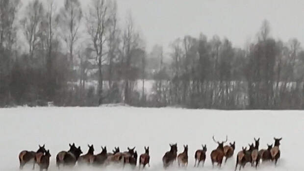 Табун вышел к людям в Угличском районе - олени пронеслись по сугробам, а затем убежали.