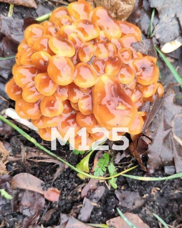 На опубликованных фотографиях видны листья салатового цвета, пробивающиеся из земли рядом с деревом, а также грибы, внешне похожие на зимние опята.