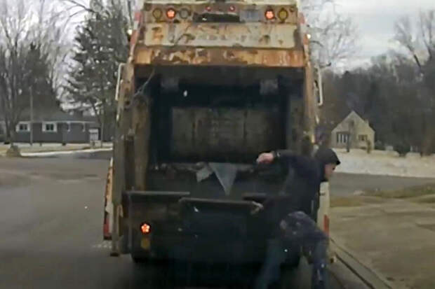 На записи видно, как сотрудник санитарной службы остановился на перекрестке, собираясь опорожнить мусорный бак, и уже катил его к мусоровозу, но, заметив внутри человека, начал махать руками, привлекая внимание стражей порядка.
