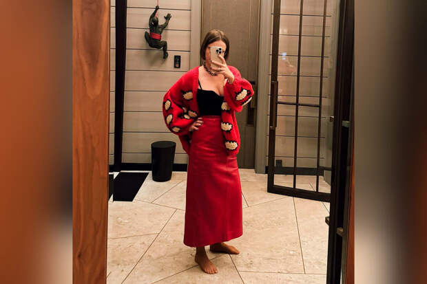 На фотографиях 42-летняя Ксения Собчак предстала в черном облегающем топе с декольте, который сочетала с красной кожаной юбкой-макси и кардиганом с овцами. Журналистка дополнила наряд массивной цепью, телесными колготками и очками для зрения.