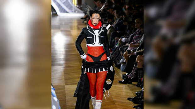 25-летняя Белла Хадид приняла участие в показе Thom Browne в рамках Недели моды в Париже. Модель вышла на подиум в красном кэтсьюте, поверх которого были надеты короткий жакет и мини-юбка. Последняя была приспущена на бедра, поэтому из-под нее выглядывали лямки от нижнего белья в духе "нулевых".