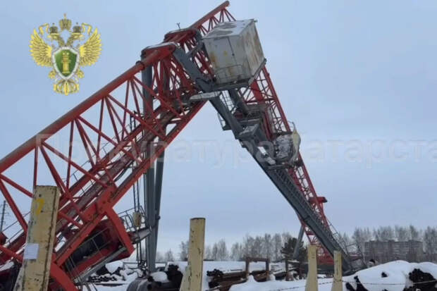 В ведомстве рассказали, что несчастный случай на производстве произошел в городе Бугульме около 12:30. В видео с территории местного механического завода на улице Ленина кран складывается пополам во время работы.