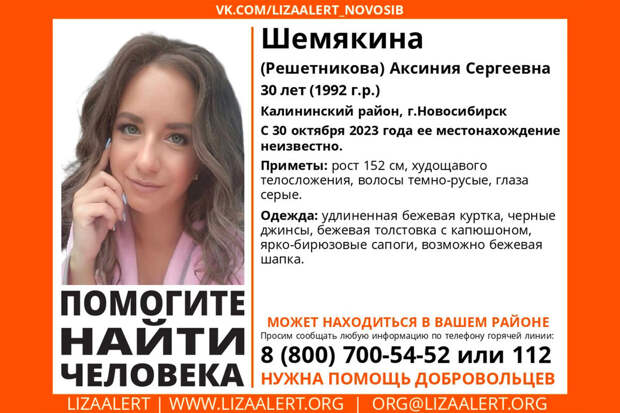 В Новосибирске разыскивают 30-летнюю Аксинию Шемякину, которая пропала в Калининском районе 10 дней назад. Об этом сообщает Сиб.фм.