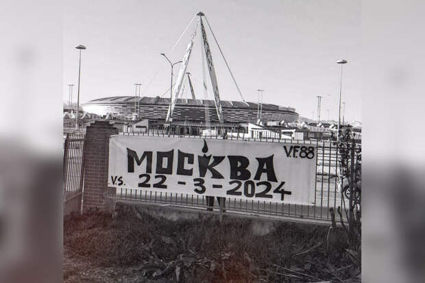 В своем аккаунте в соцсетях они разместили пост с фотографией на фоне стадиона. На фото изображен баннер с надписью "V.F.88 vs МОСКВА 22-3-2024".