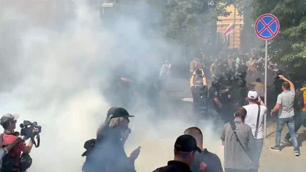 Судя по кадрам, в ходе столкновения были задействованы дымовые шашки и взрывпакеты. Националисты также кидают в полицейских автомобильные шины.