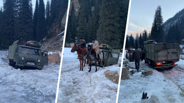 Отправившись покорять живописное Григорьевское ущелье, что к северу от Иссык-Куля, мы наткнулись на старый бортовой УАЗик, севший на брюхо в ледяной шуге. В кузове "головастика" стояли две лошади, а рядом с машиной унывали три киргиза, пытавшиеся вытащить УАЗик из плена.