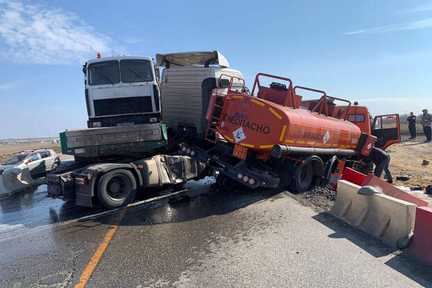 От удара грузовик с полуприцепом выбросило на встречную полосу, где он врезался в бензовоз "КамАЗ". Водитель легкового Hyundai Accent и водитель бензовоза получили травмы и были госпитализированы.