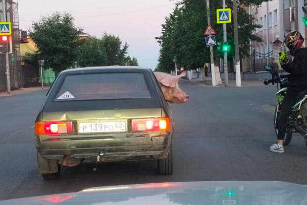 Во время ожидания зеленого сигнала светофора на перекрестке в Скопине свинья привлекла внимание мотоциклиста, стоящего у светофора. Мужчина внимательно осмотрел животное.О цели перевозки животного в салоне и пункте назначения поездки не сообщается.
