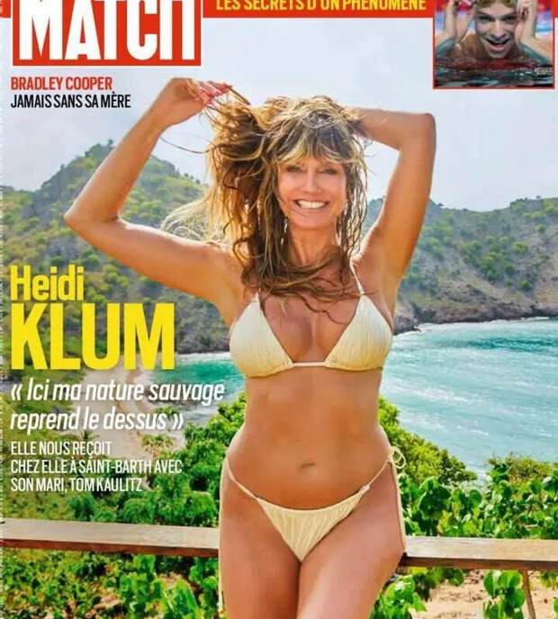 52-летняя Хайди Клум стала героиней нового выпуска журнала Paris Match. На обложке журнала супермодель предстала в бикини оттенка сливочного масла. Телеведущая позировала с взъерошенными распущенными волосами и макияжем в естественном стиле.