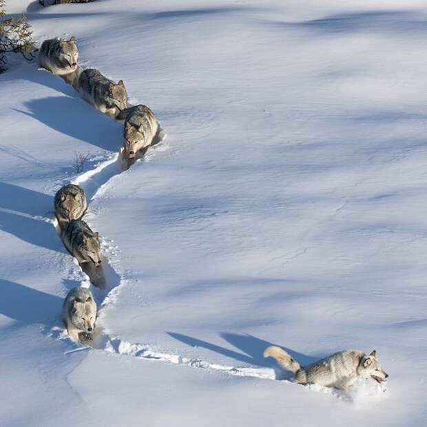 По словам фотографа Аарона Хьюи, на снимке, сделанном в парке Денали на Аляске в 2016 году, самка прокладывает тропу для своих волчат.
