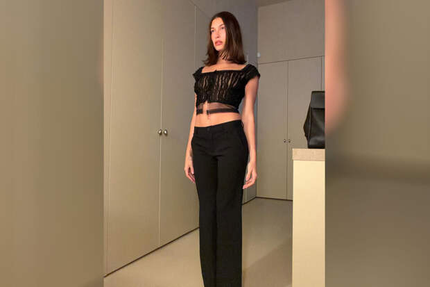 29-летняя Хейли Бибер предстала перед камерой в черном полупрозрачном топе с драпировкой, который сочетала с брюками в тон. Манекенщица позировала с уложенными распущенными волосами и макияжем в естественном стиле.