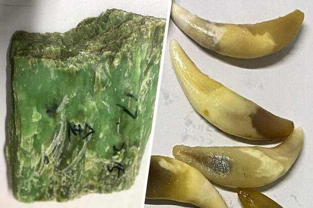 По информации ведомства, читинские таможенники в пропускном пункте "Забайкальск" обратили внимание на пассажира автобуса, который путался в ответах на вопросы. Когда гражданину КНР назначили личный досмотр, он добровольно извлек из-под одежды темно-зеленый минерал с рукописными иероглифами и цифрами, а под стельками его кроссовок нашли 25 волчьих клыков.