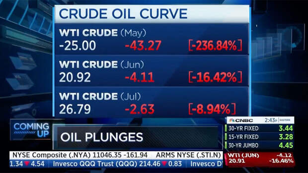 Цена на нефть американского сорта WTI с поставкой в мае на Нью-Йоркской товарной бирже (NYMEX) стала отрицательной впервые в истории, следует из данных торгов. Вечером в понедельник, 20 апреля, она пробила отметку в минус $40 за баррель. Цена на закрытии торгов в пятницу составляла $18,27 за баррель.