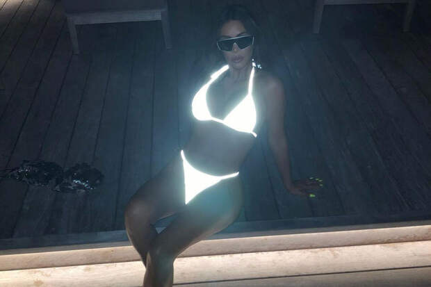 Перед камерой Ким Кардашьян позировала в светящемся белом купальнике. Образ дополнили солнцезащитные очки. Однако пользователи сайта и социальных сетей не оценили образ модели.