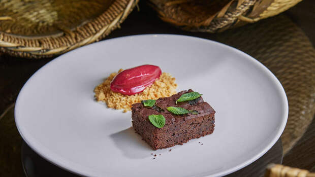 Шеф-кондитер ресторана "Пифагор" Алена Офицерова поделилась рецептом брауни с мятой. Для приготовления потребуются квадратная форма, 150 г пшеничной муки, 170 г сахара, 80 г какао, 4 г разрыхлителя, 270 г соевого молока, 65 г темного шоколада, 15 г растительного масла, 10 г мяты.