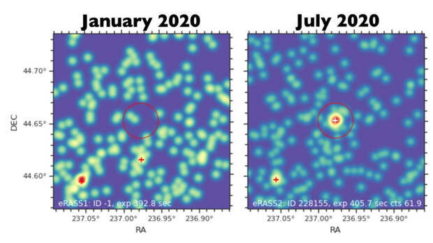 Если на момент наблюдения "Спектром-РГ" AT2020mrf была в 20 раз ярче чем AT2018cow, то на снимках Chandra сверхновая была уже в 200 раз ярче, чем сверхновая 2018 года.