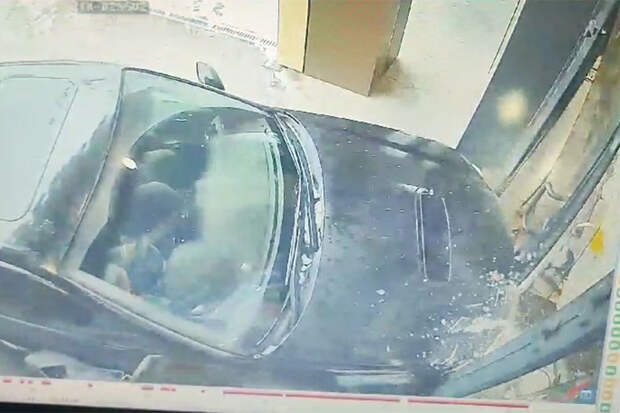 На кадрах с камеры видеонаблюдения видно, что перед столкновением машина двигалась в заносе. Она разбила капотом стеклянные входные двери и уперлась правым бортом в установленную недалеко от входа урну.