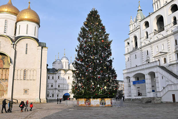 Новогоднее дерево привезли в столицу 13 декабря из подмосковного Щелковского района. В Управлении делами президента РФ рассказали, что ее украсили в стиле "Праздничный концерт".