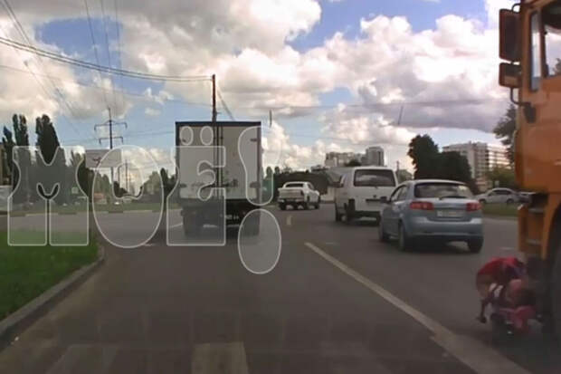 Инцидент произошел 25 августа у дома №160 по Краснознаменной улице. На кадрах, опубликованных каналом, видно, как женщина с ребенком на детском велосипеде пересекают нерегулируемый пешеходный переход, когда на них наезжает большегруз.