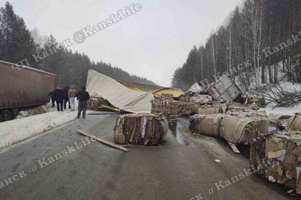 На кадрах, опубликованных Telegram-каналом "Красноярск №1", видно, что по проезжей части рассыпался груз макулатуры. Одна из фур развернута поперек дороги.