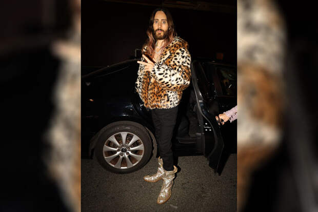 51-летний Джаред Лето появился на Неделе моды в Париже в черной юбке, "голом" топе и серебряных сапогах. Образ завершила кожаная красная перчатка. Ему также сделали укладку с локонами и макияж с угольно-черной подводкой.