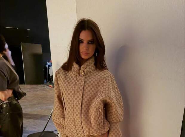 Эмили Ратаковски показала кадры с бэкстейджа съемок рекламы для Gucci. На одном из фото манекенщица была запечатлена в бежевом бомбере с монограммой бренда, ботфортах на каблуках и золотых серьгах-кольцах.