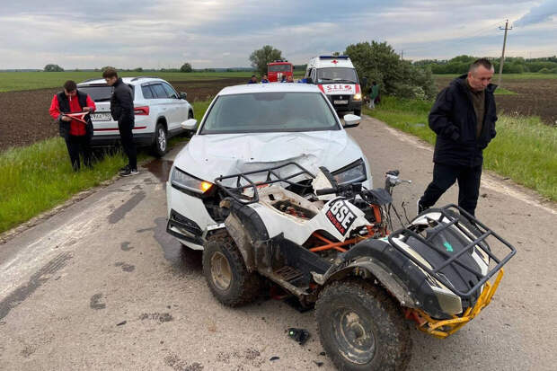 Отмечается, что за рулем легковушки в момент столкновения находился 65-летний водитель. Он не пострадал. Судя по фото, автомобиль Audi получил серьезные повреждения передней части. У него помят капот, повреждены решетка радиатора и бампер. У квадроцикла видимых повреждений нет.