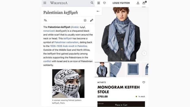"Наживаться на угнетенном народе Палестины просто позорно", – пишут недовольные в Twitter. А влиятельный Instagram-аккаунт о моде Diet Prada заявил: "Итак, позиция LVMH (международный холдинг, которому принадлежит Louis Vuitton – "Газета.Ru") по политическим вопросам всегда "нейтральная", но они все равно выпускают куфию за $705, которая является традиционным арабским головным убором, ставшим символом палестинского национализма. Странно".