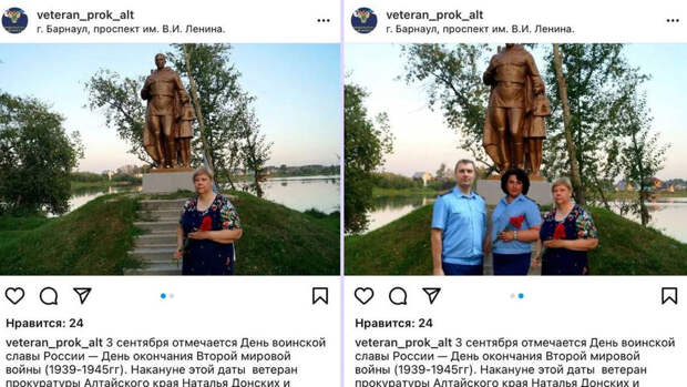 Фотографию они опубликовали в Instagram-аккаунте регионального отделения общественной организации ветеранов и пенсионеров прокуратуры.В канун 3 сентября двое прокуроров должны были возложить цветы вместе с ветераном Натальей Донских к мемориалу памяти погибших советских воинов. Однако сотрудники присутствовать на мероприятии не смогли и прифотошопили себя к снимку, указав, что посетили событие в очном формате. При этом дополнительно они загрузили и оригинал фотографии.