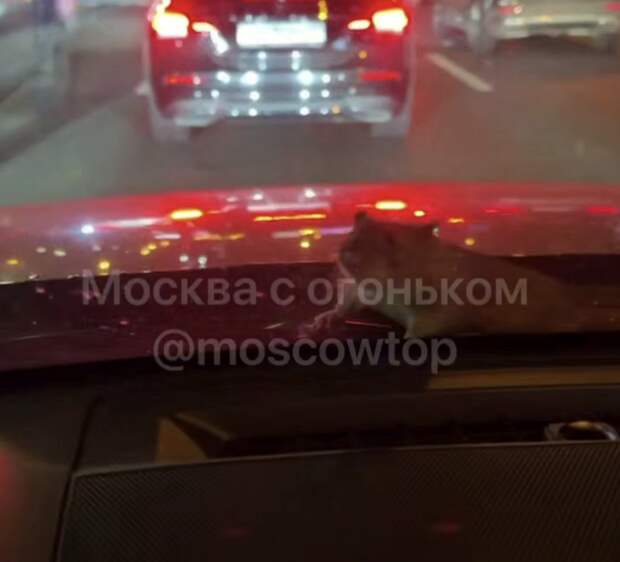 На кадрах видно, что на капоте красного автомобиля находится животное. При этом на записи заметно, что машина едет по оживленной дороге.По словам местных жителей, водители часто встречают грызунов.