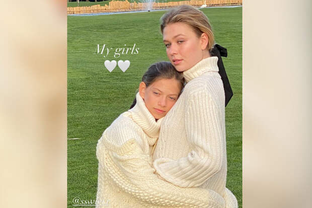 На фото девочки позировали в белых свитерах, обнимая друг друга. Волосы им завязали в низкие хвостики и добавили черные бархатные банты.