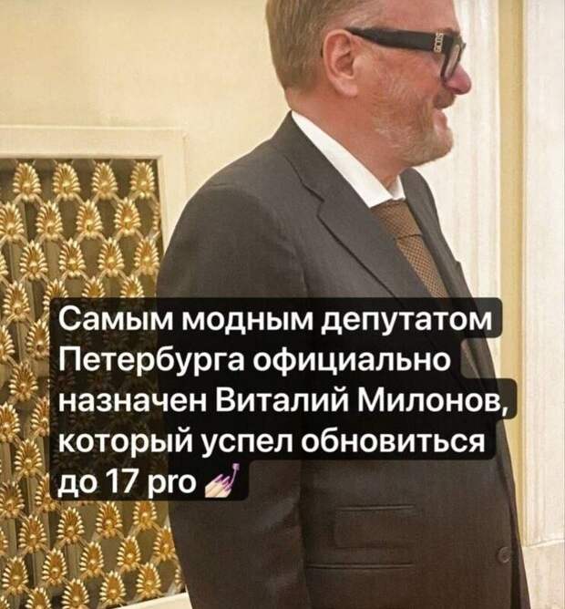 В 2024 году Милонов заявлял, что iPhone 16 Pro Max за 400 тысяч рублей купят только "бахнутые". Также депутат называл "чилийскими лошарами" тех, кто покупает дорогие телефоны. 3 октября в СМИ появилась фотография Милонова с новым iPhone 17 Pro.