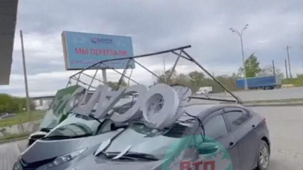 Рекламная вывеска страховой компании упала на припаркованные иномарки в Татарстане. Видео опубликовано в Telegram-канале "В Татарстане Поймут".