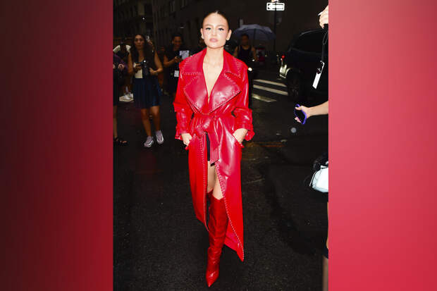 Лени Клум присоединилась к недавно обручившимся Зои Дешанель и Джонатону Скотту на показе новой коллекции американского модного бренда Alice + Olivia. 19-летняя модель выбрала для мероприятия ярко-красный кожаный плащ, глубокий вырез которого подчеркнул пышный бюст девушки.