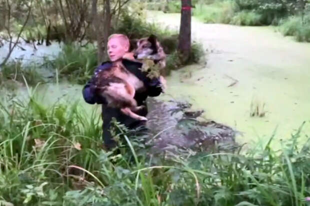Местная жительница вызывала спасателей, один из них пробрался к собаке через болото и вынес на сушу на руках.